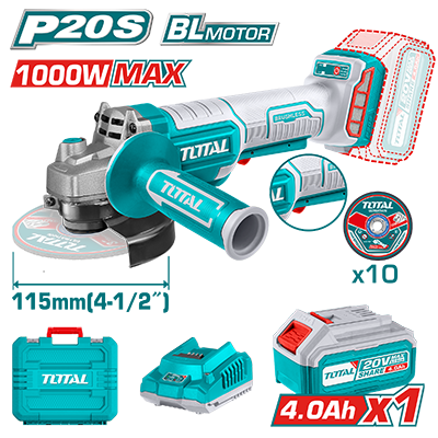 TAGLI2111561 - جلخ بطارية 20 فولت 4.5 انش 1000 واط BL + بطارية 4 امبير + شاحن + 10 قطع حجر قص ضمن حقيبة بلاستيك ماركة TOTAL