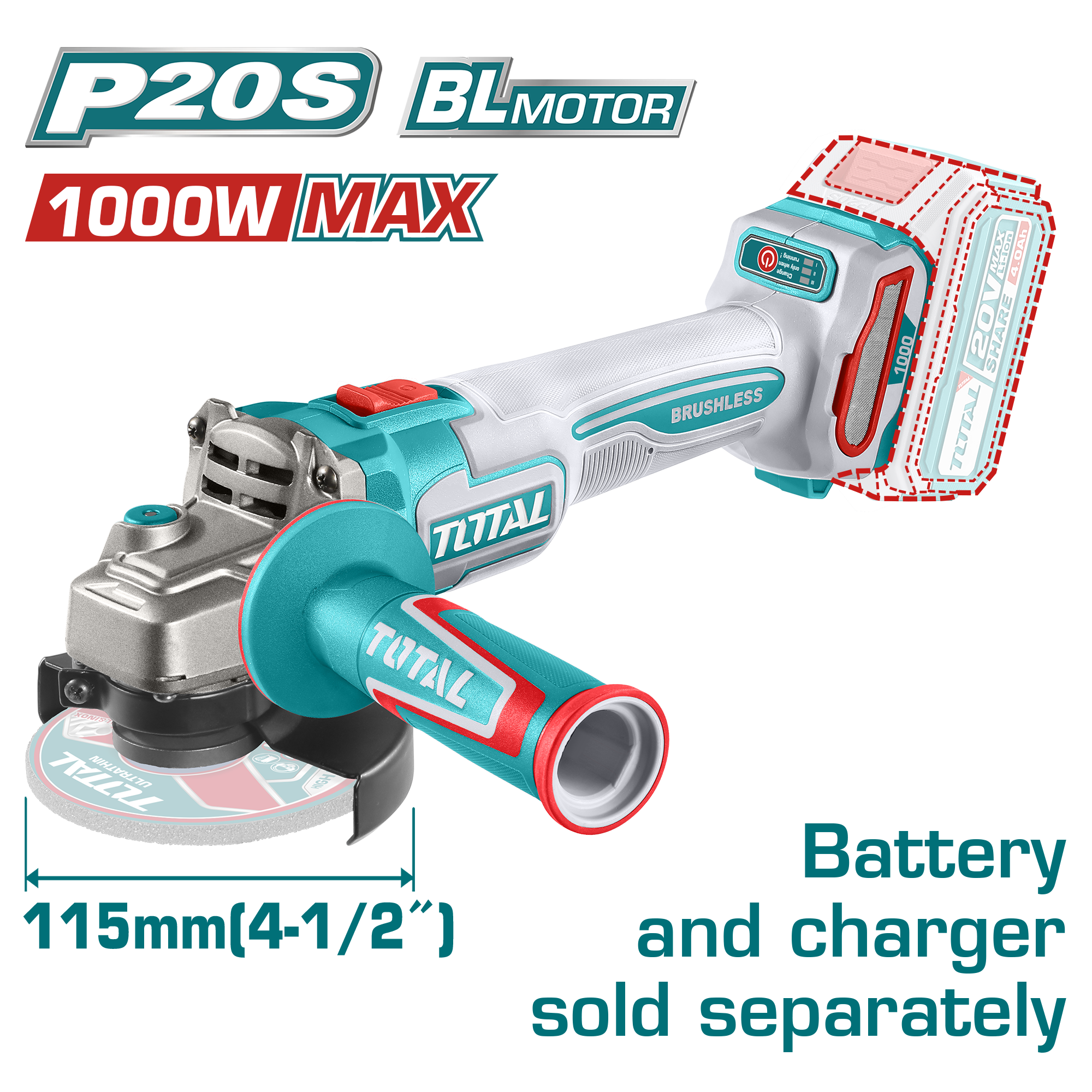 TAGLI27153 - جلخ بطارية 20 فولت 4.5 انش 1000 واط BL بدون بطارية و شاحن TOTAL