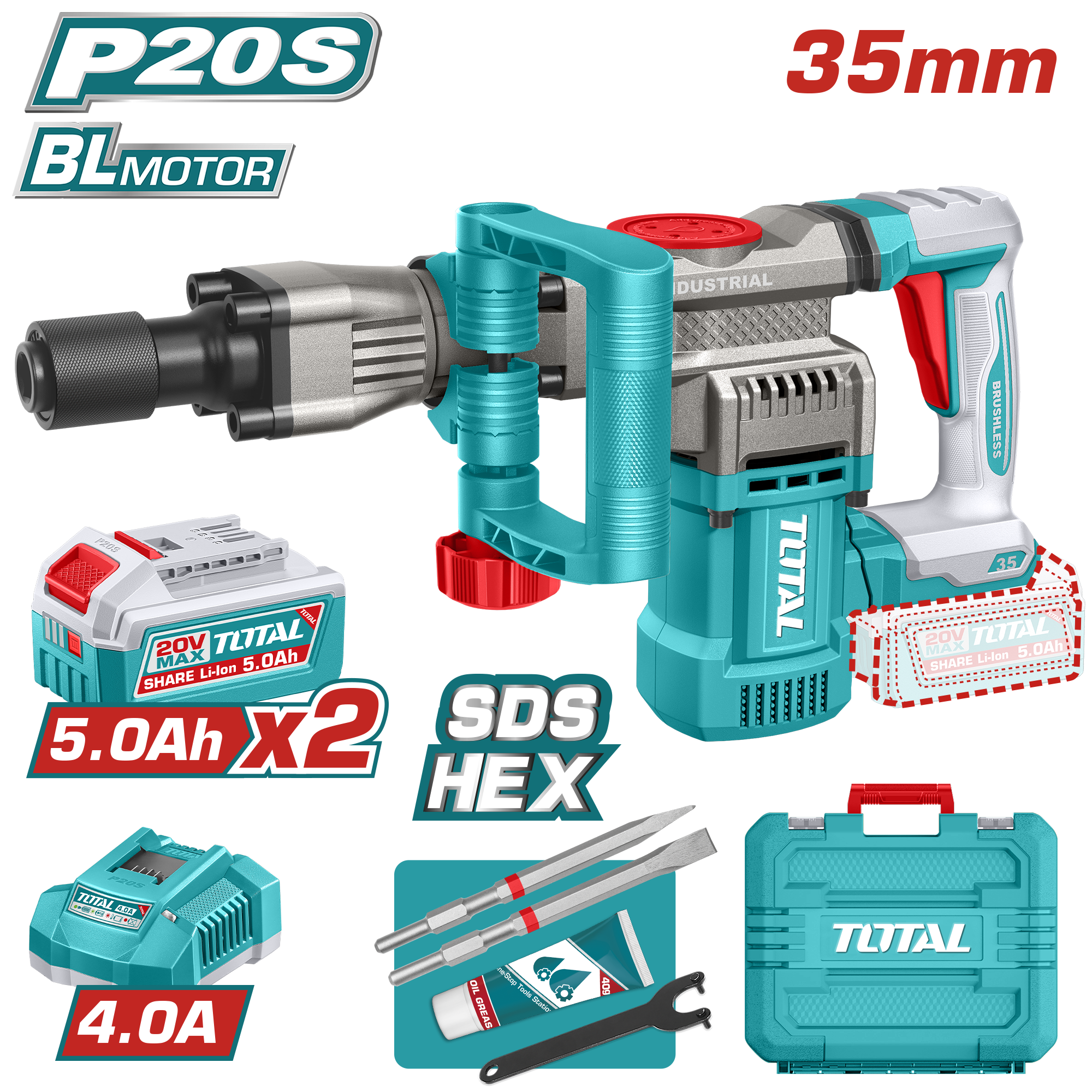 TDBLI203582 - كسارة بطارية 20 فولت 35 مم BL عزم 16 جول SDS-HEX + بطارية 5 امبير عدد 2 + شاحن واكسسوارات ضمن حقيبة بلاستيك TOTAL