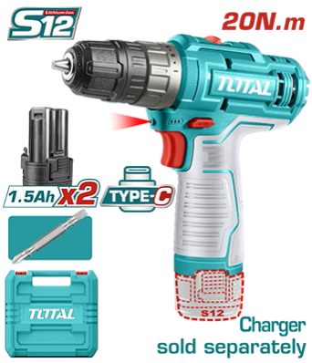 TDLI12202 - مثقب بطارية 12 فولت 10 مم 20 نيوتن بطاريتين TYPE-C بدون شاحن حديث حقيبة بلاستيك ماركة TOTAL سوبر توتال