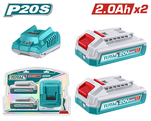 TFBCPK1222 - مجموعة شحن 20 فولط بطارية 2 امبيرعدد 2 + شاحن على كرت بلاستيك TOTAL حديث