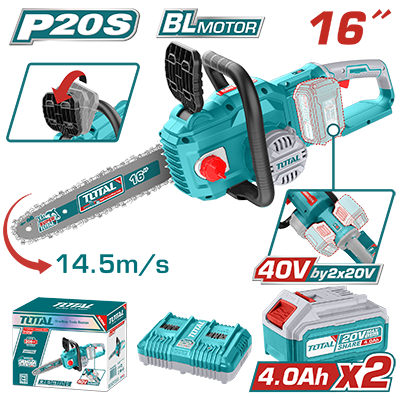 TGSLI401682 - منشار شجر بطارية 40 فولت 16 انش BL + بطارية 4 امبير عدد 2 + شاحن مزدوج صناعي TOTAL