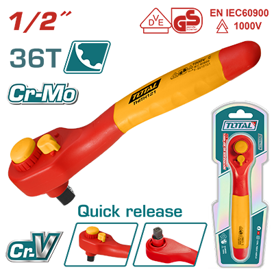 Insulated ratchet wrench 1000V, VDE/GS certification Size: 1/2″ 36T Length: 250mm Material : Cr-V+Cr-Mo Manufactured according to EN60900 Packed by double blister