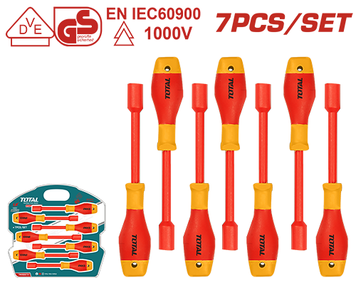 7 Pcs insulated nut screwdriver set 1000V, VDE/GS certification Include: 6x125mm 7x125mm 8x125mm 9x125mm 10x125mm 11x125mm 12x125mm Material: 50BV30 Packed by double blister