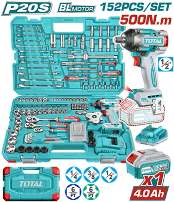 THKTHP31522 - حقيبة 152 قطعة مع فرد شد 500 نيوتن 20 فولت بطارية واحدة 4 امبير مع شاحن واكسسوار حديث حقيبة بلاستيك ماركة TOTAL