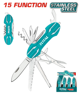 1.Large knife 2.Can opener 3.Phillips screwdriver 4.Leather punch 5.Bottle Opener 6.Scissors 7.Needle 8.Slotted Screwdriver 9.Fish scaler 10.Hook remover 11.Saw 12.corkscrew 13.Nail cleaner 14.Nail file 15.Key ring