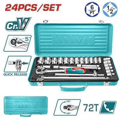 THT121242 - طقم فنجان 1/2 انش 24 قطعة مع مفتاح طقطاق + تطويلة متحركة ضمن حقيبة معدن TOTAL حديث