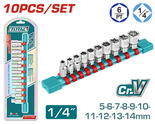 THT1411023 - طقم جوز 1/4 انش 10 قطعة بدون طقطاق من 5 الى 14 مم ماركة TOTAL