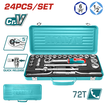 THT141253 - طقم فنجان 1/2 انش 24 قطعه مع مفتاح طقطاق + تطويلة منحنية + مفتاح Tمتحرك ضمن حقيبة معدن TOTAL صناعي