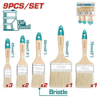 9pcs paint brush set 3pcs 1″ 2pcs 1.5″ 2pcs 2.0″ 1pcs 3.0″ 1pcs 4.0″ Wooden handle Packed by double blister