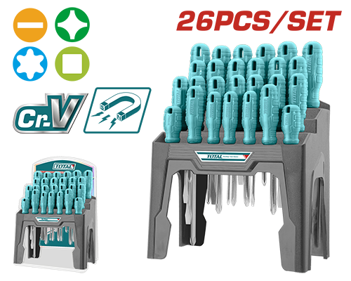 THTDC252601 - طقم مفكات براغي 26 قطعة شق +مصالب DC كروم مغناطيس على ستاند بلاستيك TOTAL