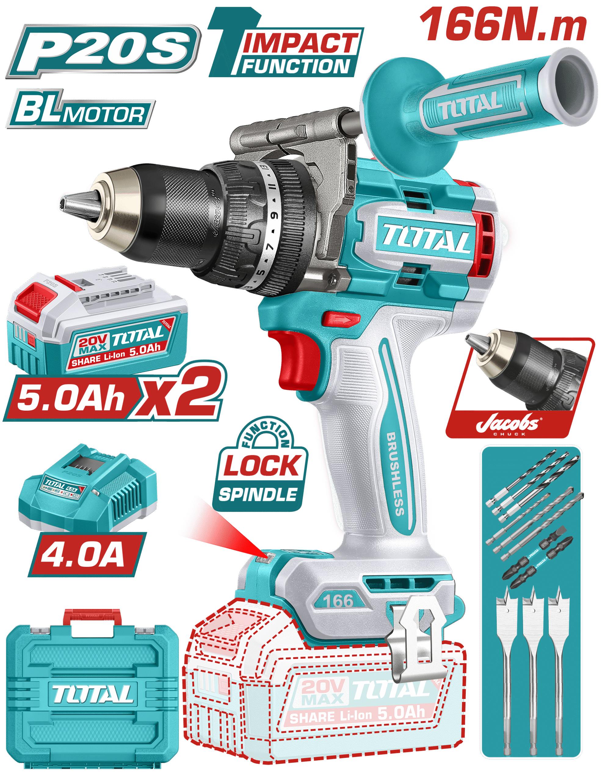 TIDLI201668 - مثقب بطارية 20 فولت 166 نيوتن BL + بطارية 5 امبير عدد 2 + شاحن + اكسسوارات ضمن حقيبة بلاستيك TOTAL