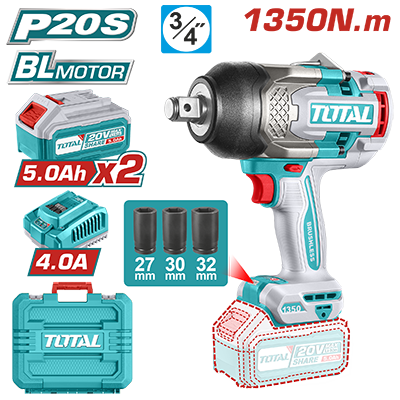 TIWLI20135 - فرد شد بطارية 20 فولت 3/4 انش 1350 نيوتن BL + بطارية 5 امبير عدد 2 + شاحن 4 امبير + مجموعة جوز ضمن حقيبة بلاستيك TOTAL