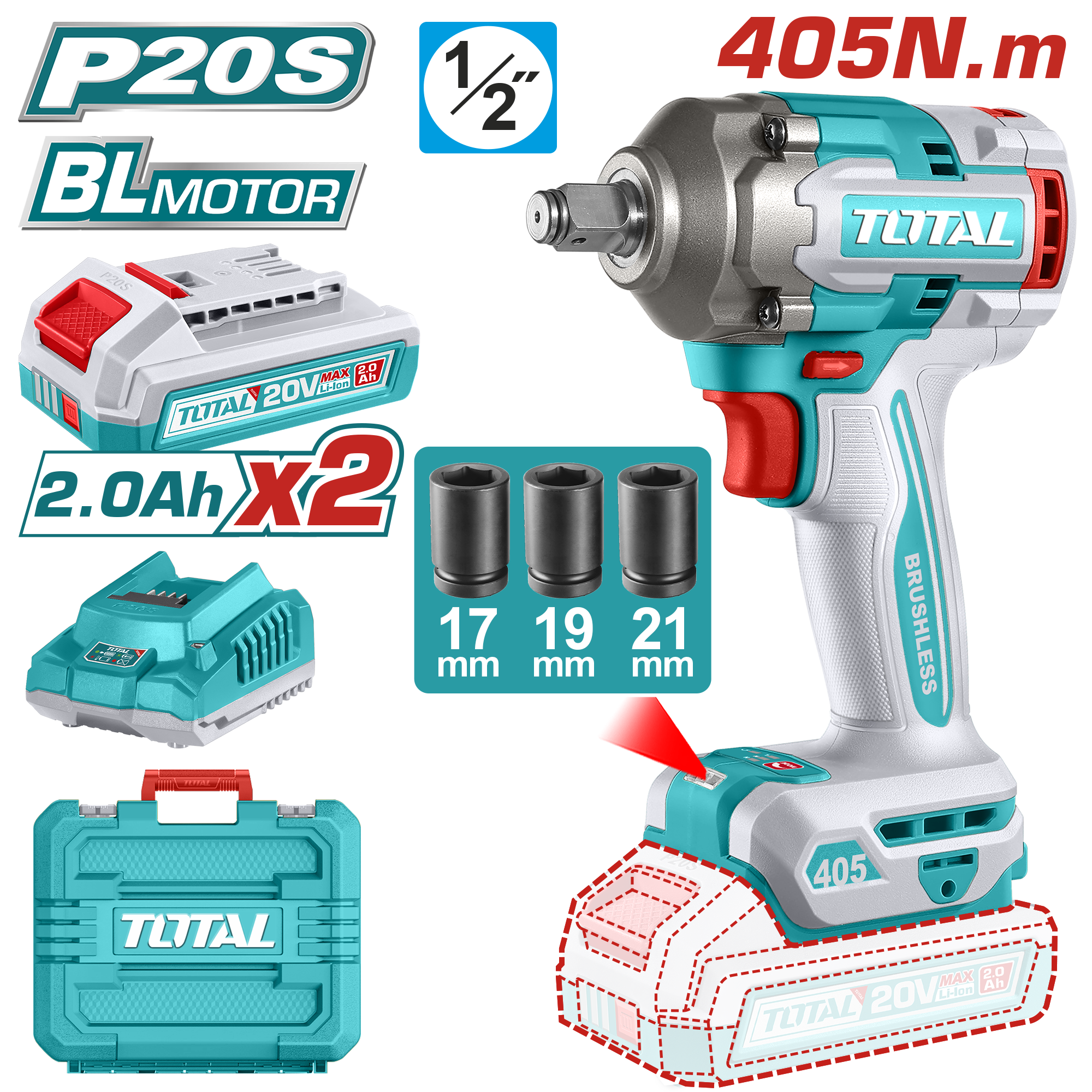 TIWLI2045 - فرد شد بطارية 20 فولت 1/2 انش 405 نيوتن BL +بطارية 2 امبير عدد 2 + شاحن +اكسسوارت ضمن حقيبة بلاستيك TOTAL