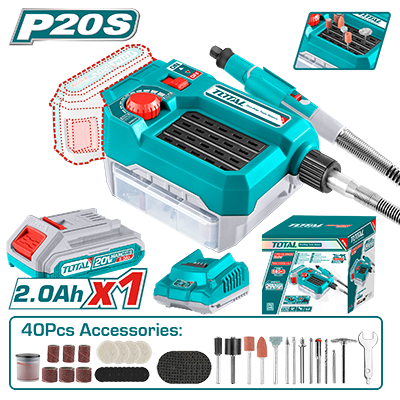 TMGLI20011 - جلخ بطارية 20 فولت محوري مع قاعدة 33,000 دورة مع بطارية 20 فولط وشاحن + اكسسوار 40 قطعة حديث ماركة TOTAL