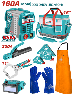 TOS23095 - كومبو 8 قطع طرنس لحام 160 امبير ميني + زوايا لحام عدد 6 + بانسة لقط 11 انش +نظارات لحام اتوماتيك + مريول جلد طويل + بانسة لحام 300 امبير + كفوف جلد + حقيبة 16 انش TOTAL