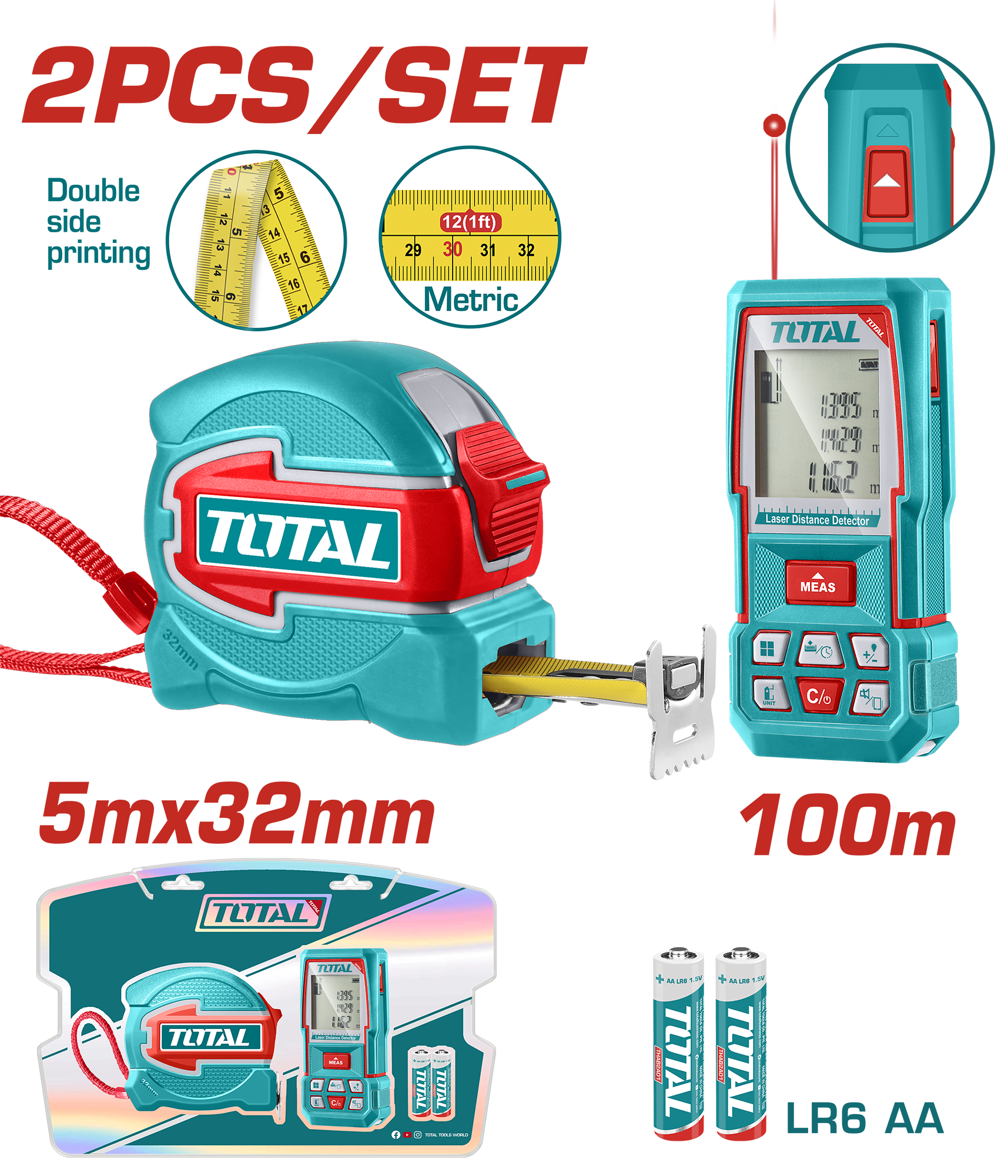 TOS250902M - مجموعة قياس متر ليزر احمر مجال 100- 0.05 متر + متر عادي 32×5 مكوشك كرت بلاستيك TOTAL