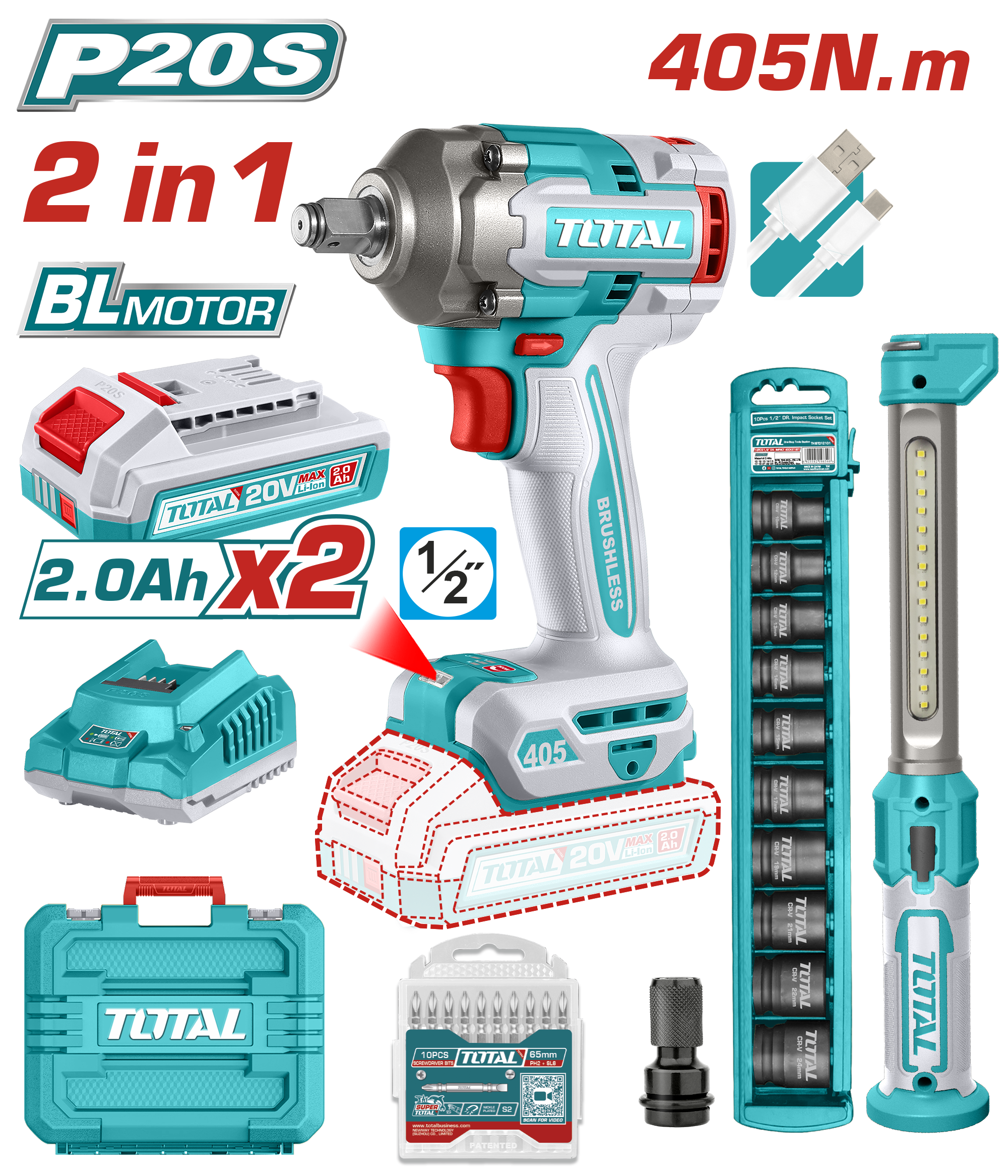 TOSLI23056 - كومبو 2 قطعة فرد شد 1/2 انش 405 نيوتن +لمبة عمل 300 لومينز+بطاريتين 2 امبير +شاحن +اكسسوارات ضمن حقيبة بلاستيك TOTAL