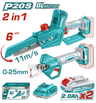 TOSLI240306 - كومبو 2 قطعة مقص كساح 25 مم + منشار شجر 6 انش + بطارية 2 امبير عدد 2 + شاحن TOTAL