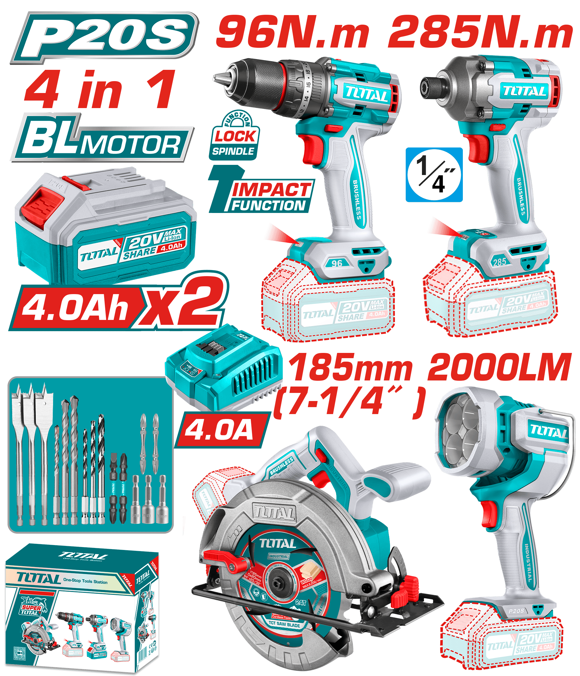 TOSLI241297 - A - كومبو 4 قطع فرد شد 1/4 انش 285 نيوتن + مثقب 96 نيوتن + قصاصة خشب 185 مم+لمبة عمل 2000 لومينز +شاحن +اكسسوارات بدون بطاريات TOTAL