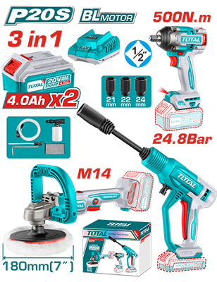 TOSLI250184 - كومبو 3 قطع فرد شد 1/2 انش 500 نيوتن + مغسل 24.8 بار + جلخ بوليش 7 انش + بطارية 4 امبير عدد 2 + شاحن TOTAL