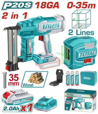 TOSLI250201 - كومبو 2 قطعة كباسة مسامير 20 فولت 18 GA + شقلة ليزر خطين اخضر + بطارية 2 امبير + شاحن + اكسسوارات TOTAL