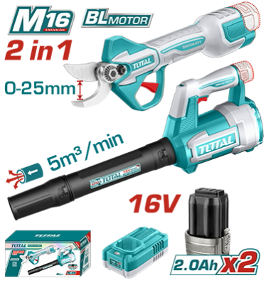 TOSLI250385 - كومبو 2 قطعة 16 فولت مقص كساح 25 مم + كور هواء + بطارية 2 امبير عدد 2 + شاحن TOTAL