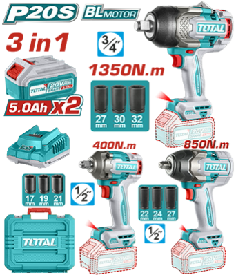 TOSLI250386 - كومبو 3 قطع فرد شد 3/4 انش 1350 نيوتن + فرد شد 1/2 انش 850 نيوتن + فرد شد 1/2 انش 400 نيوتن + بطارية 5 امبير عدد 2 + شاحن + 9 قطع جوز ضمن حقيبة بلاستيك TOTAL