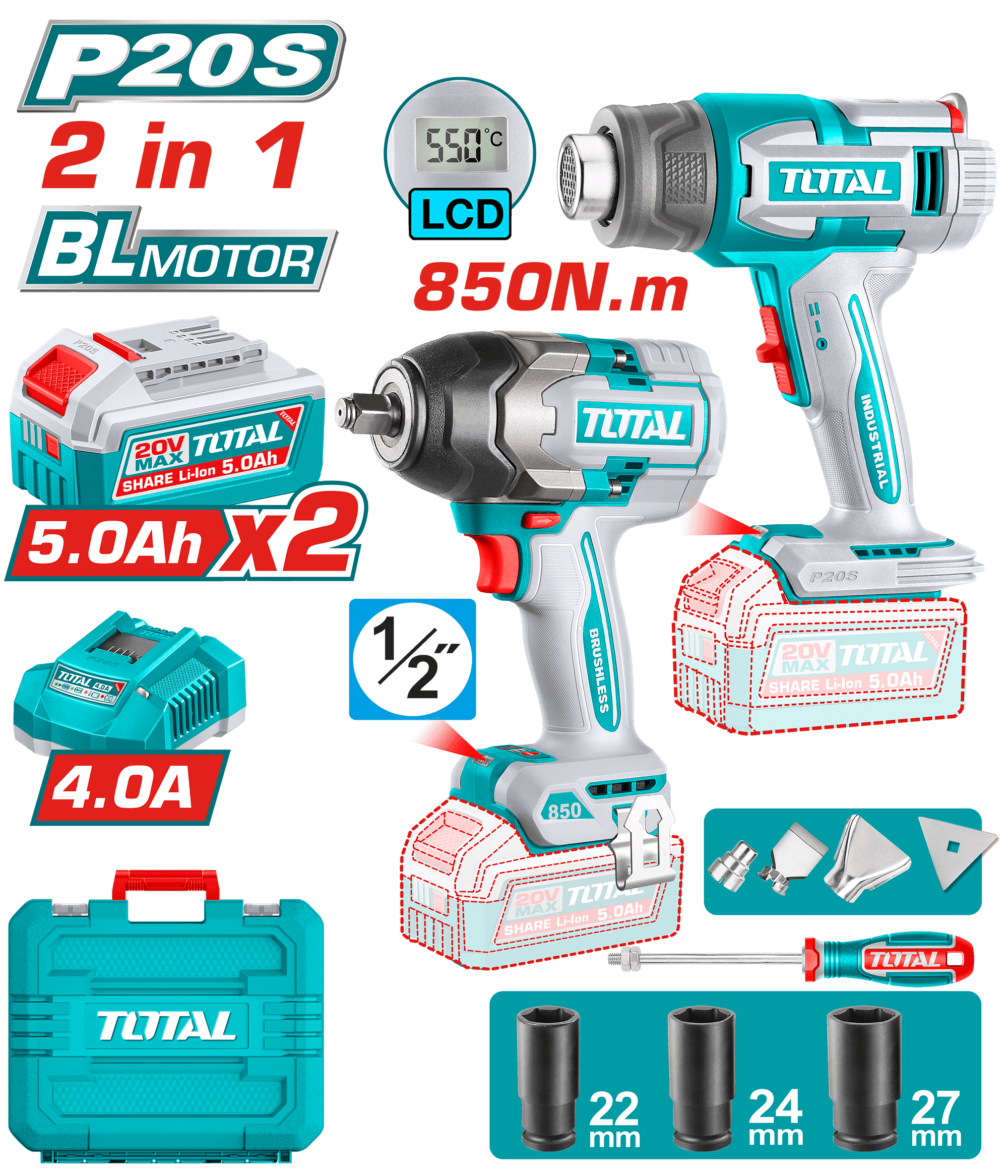 TOSLI250983 - كومبو 2 قطعة فرد شد 1/2 انش 850 نيوتن + كور هواء ساخن ديجيتال + بطارية 5 امبير عدد 2 +شاحن 4 امبير+ اكسسوارات ضمن حقيبة بلاستيك TOTAL
