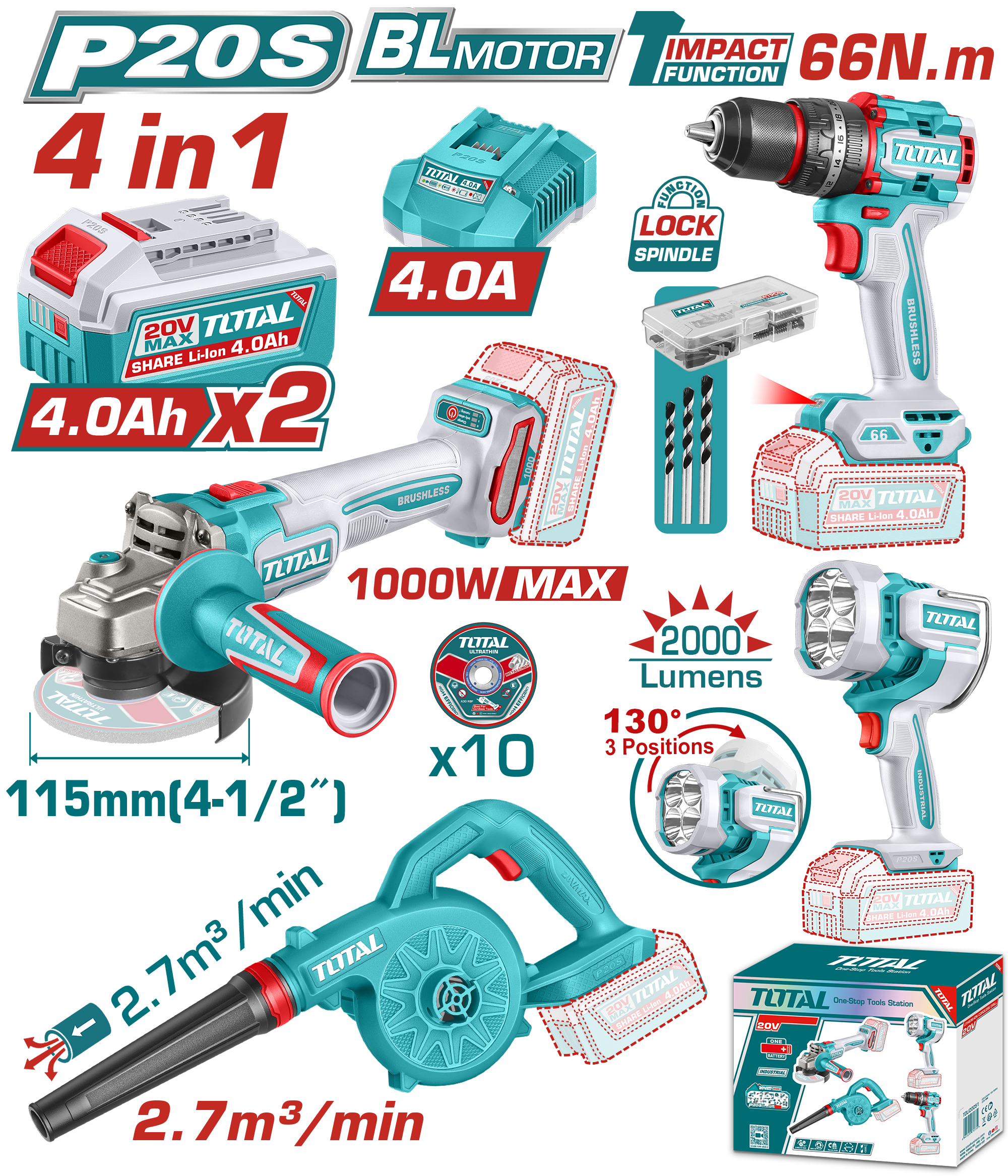 TOSLI250993 - كومبو 4 قطع 20 فولت مثقب بطارية 66 نيوتن + جلخ 4.5 انش 1000 واط BL +كور هواء سرعة واحدة + كشاف 2000 لومينز +بطارية 4 امبير عدد 2 + شاحن 4 امبير + اكسسوارات TOTAL