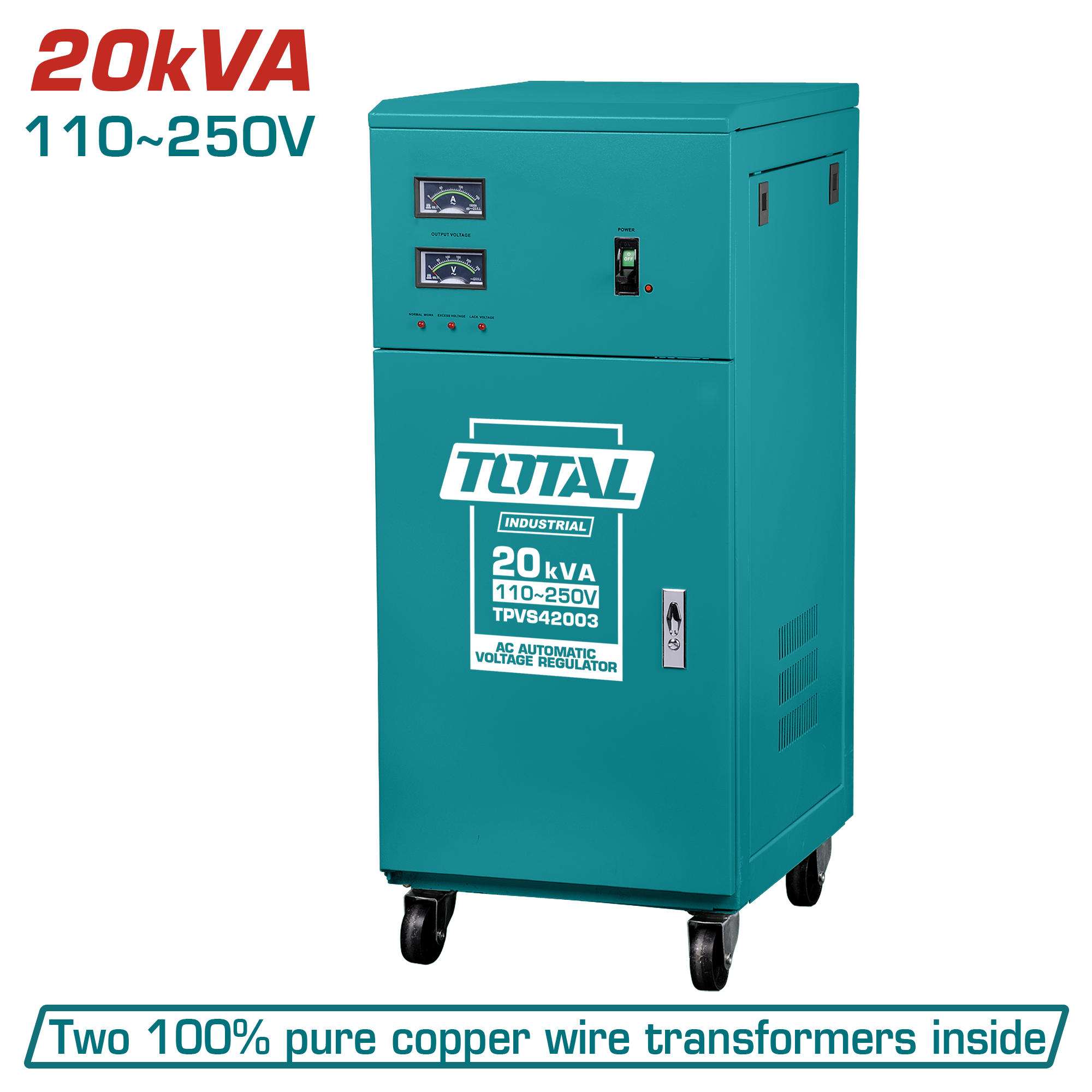 TPVS42003 - منظم رافع جهد سيرفو 20 KVA من 110 الى 250 KVA ماركة TOTAL مع حماية من الارتفاع والانخفاض 184+246 +-4% مع ميزة تأخير +بايباس صناعي