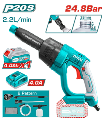 TPWLI20084 - مغسل بطارية 20 فولت ضغط 24.8 بار تدفق 2.2 ليتر بالدقيقة مع نظام إيقاف الي + بطارية 4 امبير عدد 1 + شاحن + اكسسوارات TOTAL