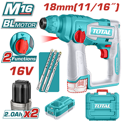 TRHLI16168 - مثقب بطارية 16 فولت SDS محرك BL + بطارية 2 امبير عدد 2 + شاحن+ اكسسوارات ضمن حقيبة بلاستيك ماركة TOTAL