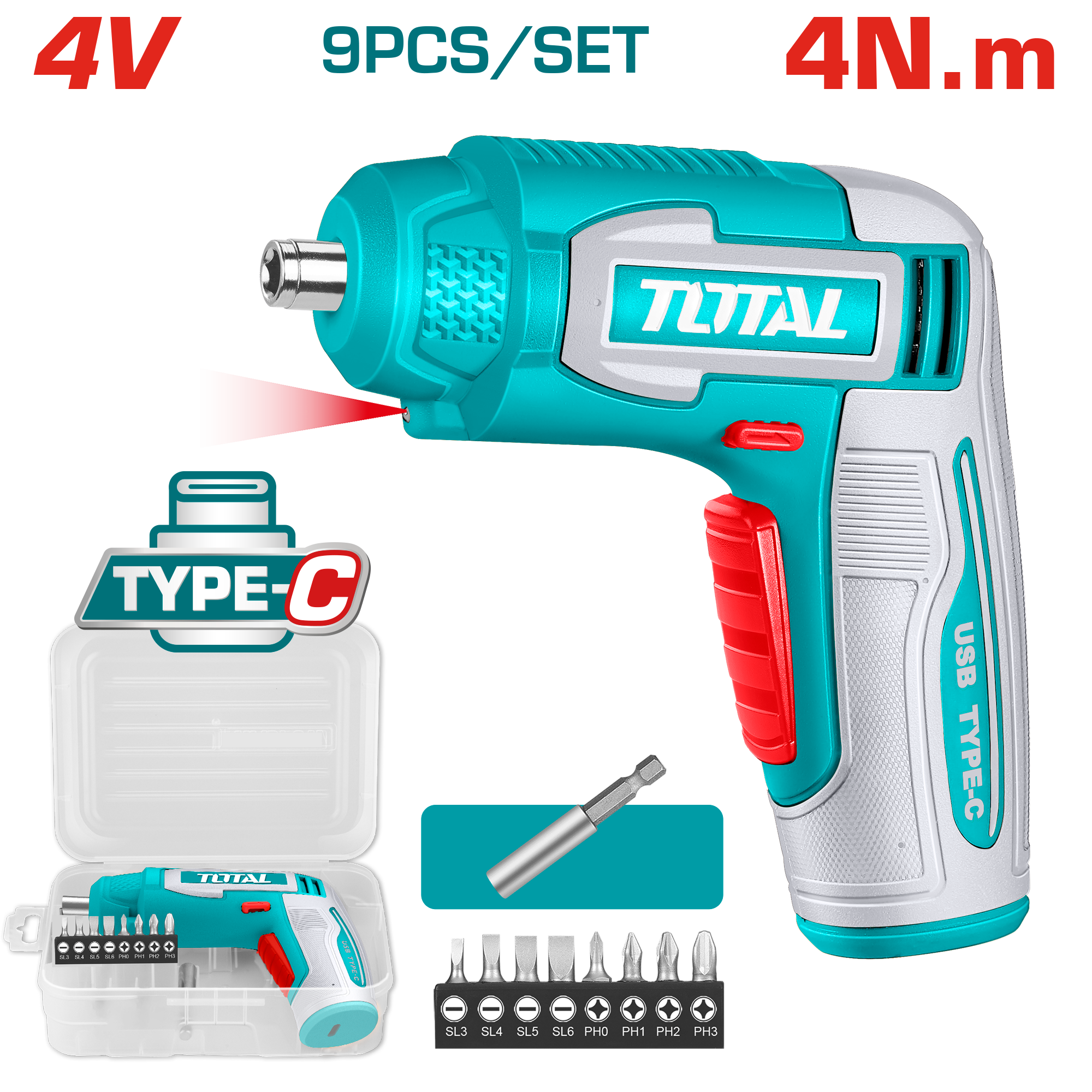 TSDLI0458 - مفك براغي 4 فولت عزم 4 نيوتن شحن TYPE-C + اكسسوارات ضمن حقيبة بلاستيك TOTAL