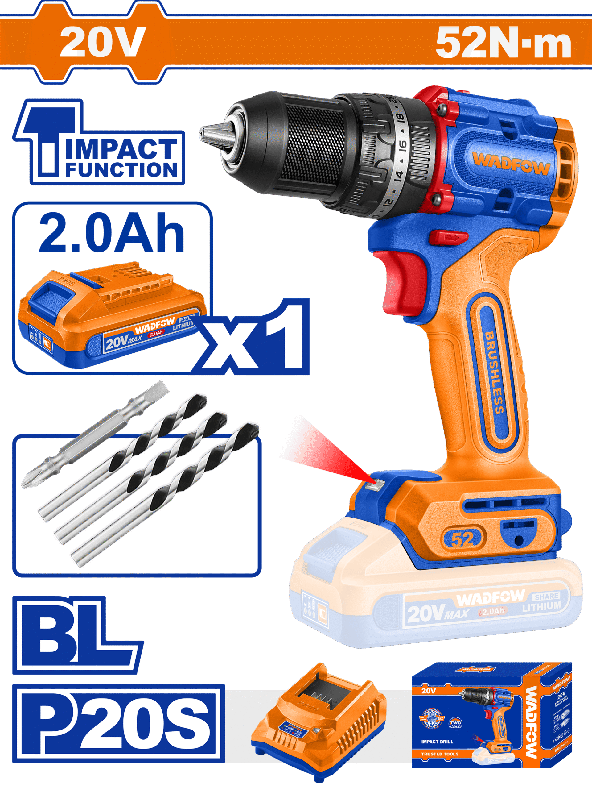 WCDP5282 - مثقب بطارية 20 فولت رجاج 52 نيوتن رجاج BL كوان بلاستيك 13 مم مع بطارية واحدة 2 امبير وشاحن واكسسوار WADFOW