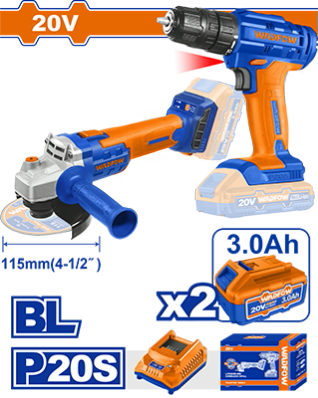 WCK20512 - كومبو 2 قطعة مثقب 35 نيوتن BL + جلخ 4.5 انش BL + بطارية 3 امبير عدد 2 + شاحن + اكسسوارات ضمن حقيبة بلاستيك WADFOW