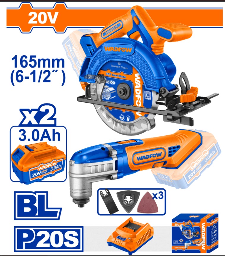 WOS240981 - كومبو 2 قطعة قصاصة خشب 165 مم + جهاز ترددي متعدد الاستعمالات + بطارية 3 امبير عدد 2 + شاحن WADFOW