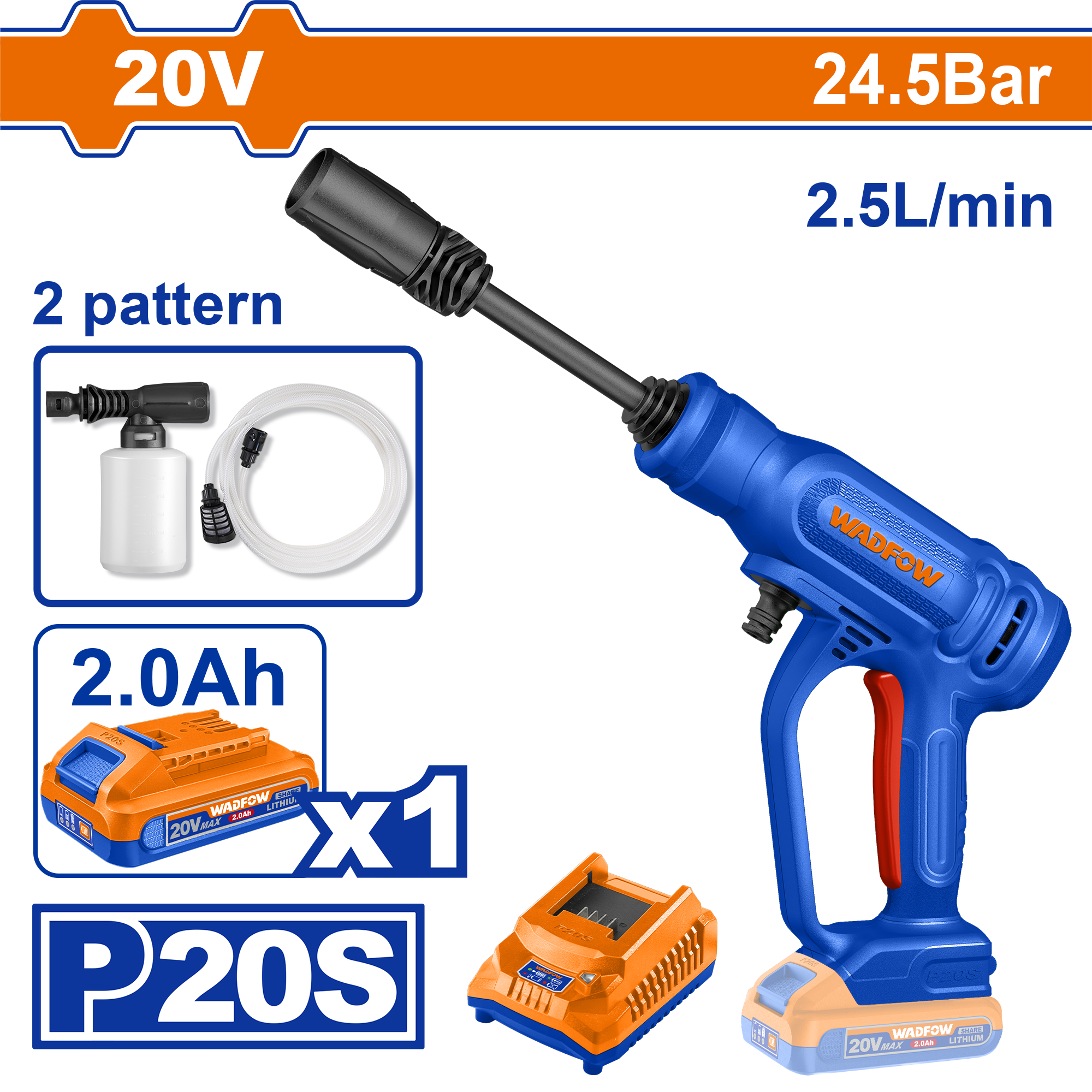 WQX01203 - مغسل سيارات بطارية 20 فولت 24.5 بار + بطارية 2 امبير + شاحن + اكسسوارات WADFOW